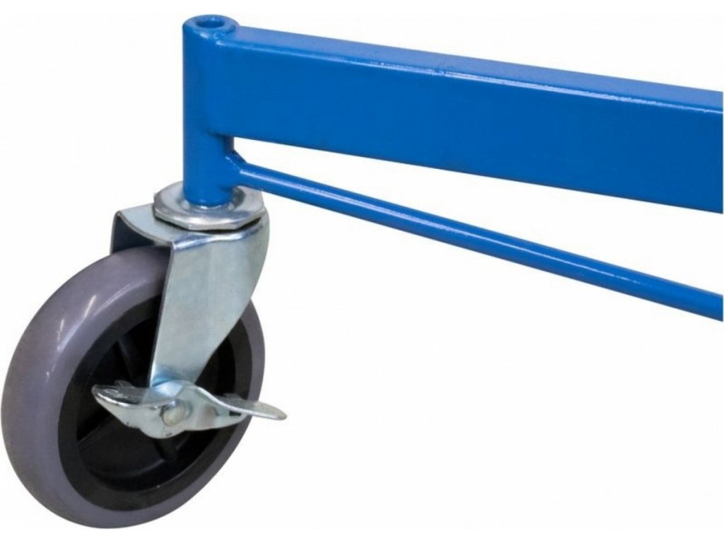 Konstrukce: stabilní trojramenný podstavec, ovládací kolo s aretací výšky, polyuretanová pojezdová kola (průměr: 13 cm; s brzdami).